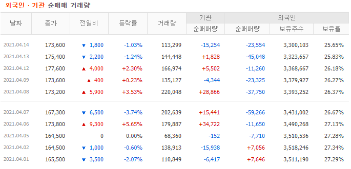 외국인은 8 거래일 연속 매도하여 25.65%를 보유하고 있습니다.