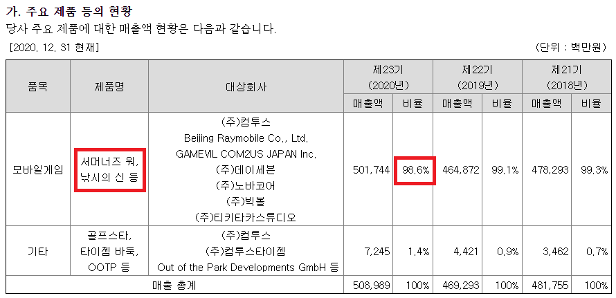 모바일 게임이 전체 매출액에 98%를 책임지고 있습니다.