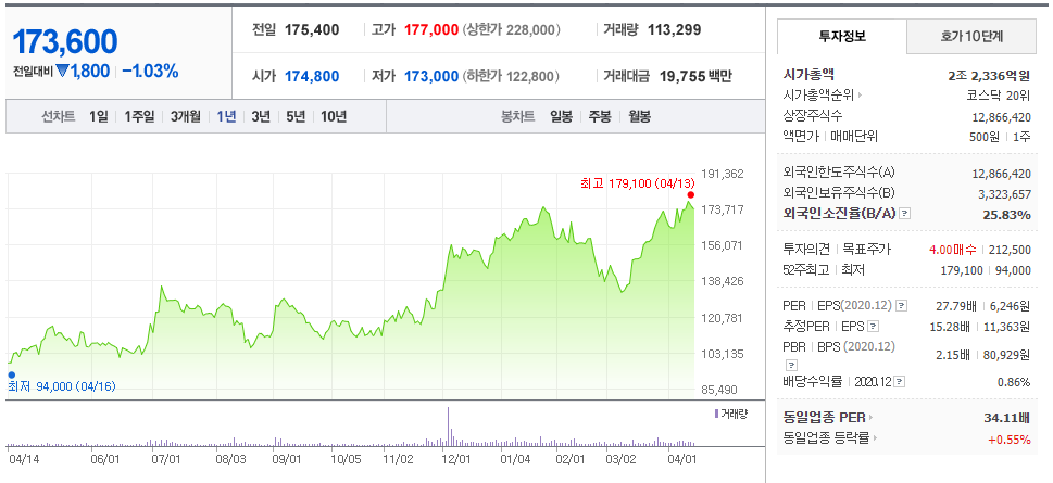 최근 13만 원 중반까지 조정을 받았다가 신작 모멘텀으로 18만 원 가까이 상승하였습니다.