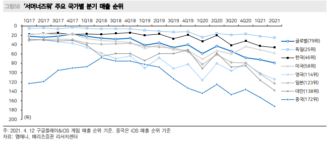 서머너즈 워의 구글 플레이&IOS 게임 매출 순위는 글로벌 79위를 기록하고 있습니다.