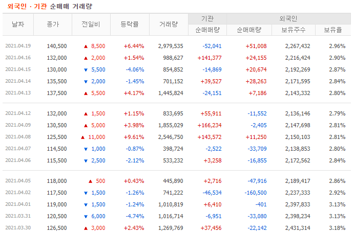 외국인은 쭉 매도로 일관하다가 최근 5 거래일 연속 매수하면서 보유율을 2.96%까지 높였습니다.