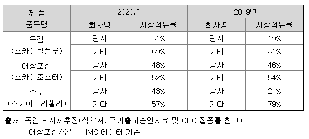 독감백신인 스카이셀플루는 작년 점유율이 12% 상승하여 31%를 차지하였습니다.