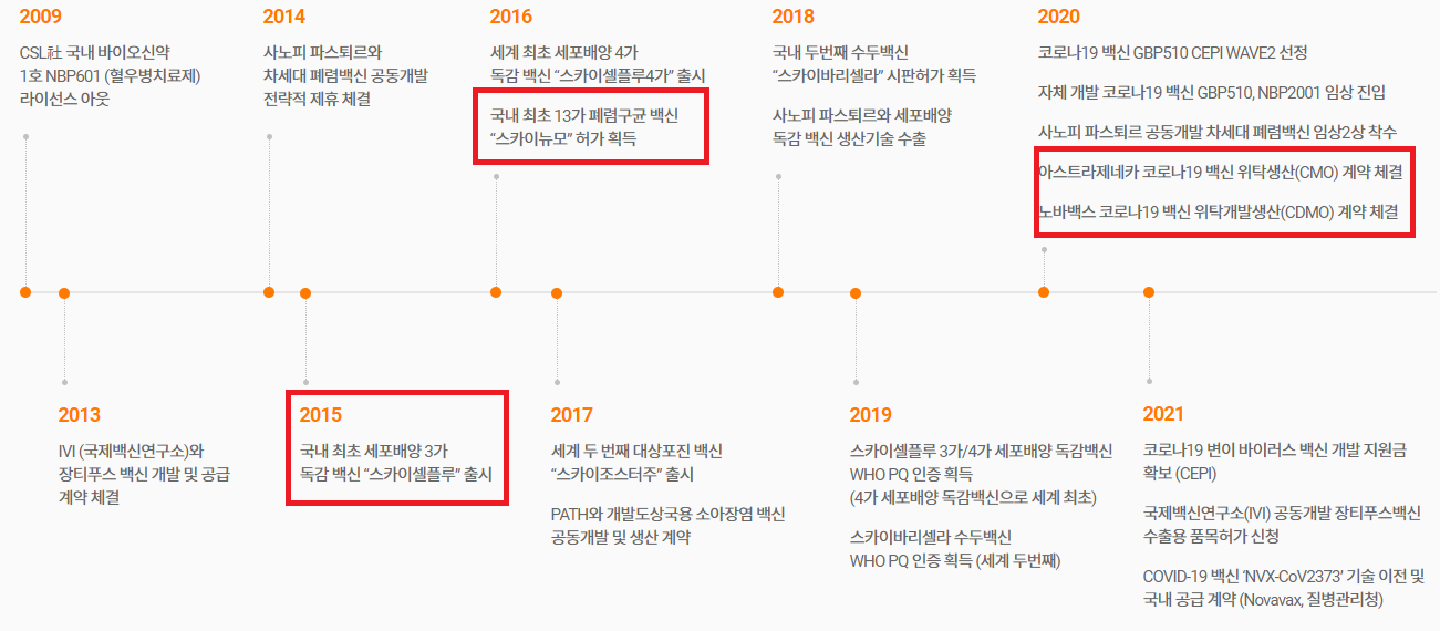 "2008년부터 프리미엄 백신을 차세대 성장 동력으로 선정한 뒤 생산 및 인프라에 지속적으로 투자해 2015년 세포배양 3가 독감백신 출시에 이어 세포배양 4가 독감백신, 대상포진 백신, 수두 백신을 출시하며 성과를 가시화했습니다. 또한 우수한 백신 연구 능력을 바탕으로 세계적인 백신 기업인 사노피 파스퇴르와 차세대 폐렴구균 백신에 대한 공동 개발을 추진하고 있으며, 2020년부터는 코로나 19 백신의 개발뿐 아니라 선도 해외 백신 개발기업들과의 CMO, CDMO 계약 등을 통해 글로벌 시장 진출을 본격화하고 있습니다. - 출처 : SK바이오사이언스 홈페이지"