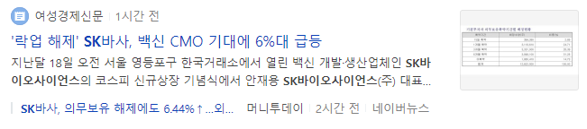 하지만 오히려 백신 위탁생산(CMO)에 대한 기대감이 반영되면서 4%대 상승으로 마감하였습니다.