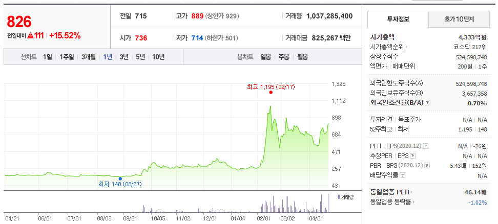 백신 발표 이전에 250원이던 주가가 급속도로 상승하여 1200원까지 올라갔었습니다.