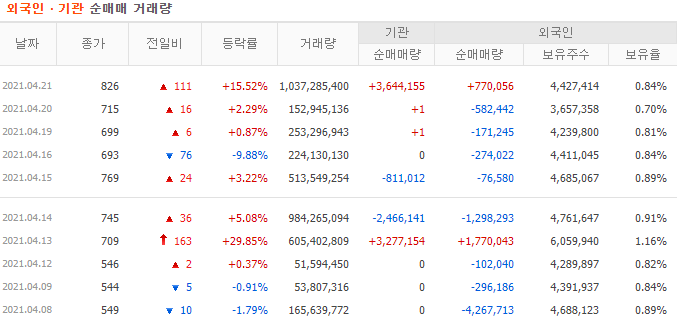 주가가 폭등하는 날에는 기관과 외국인이 동시에 대량으로 매수하였습니다.