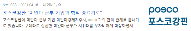포스코강판은 최근 미얀마 군부 기업 MEHL과의 합작 관계를 끝내기로 결정하였습니다.