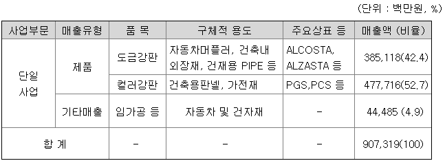 제품의 판매비중을 보면 자동차머플러, 건축 내외장재 등에 사용되는 도금강판이 42%를 차지하고 있습니다.