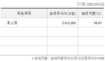 최대주주는 모회사인 포스코로 56%를 소유하고 있습니다.