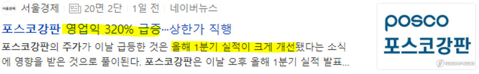 포스코강판의 1분기 실적이 크게 개선되면서 주가가 이틀 연속 급등하였습니다.