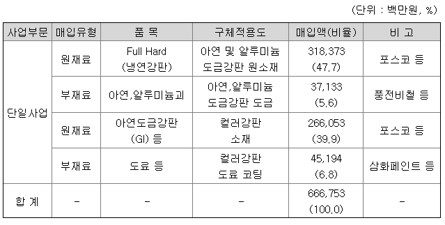 그 외에 컬러강판을 만들기 위한 도료 등을 삼화페인트에서 매입하고 있네요.