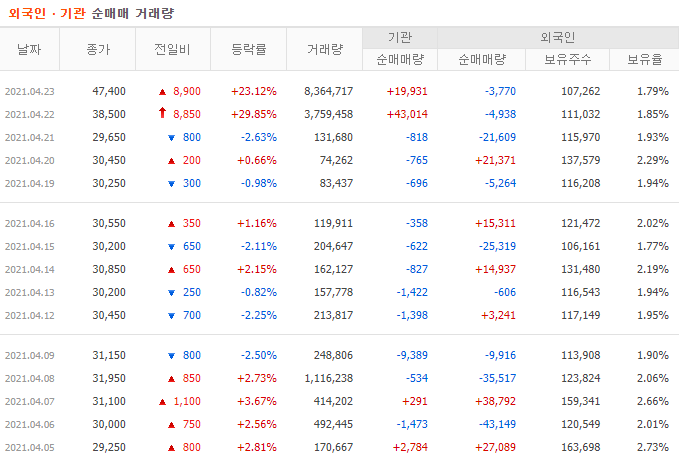 22일에는 상한가를 기록하였으며 23일에는 23%급등하여 47,400원을 기록하며 사상 최고가를 경신하였습니다.