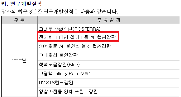 포스코강판은 작년에 전기차 배터리 셀 커버용 AL컬러강판을 개발하였습니다.