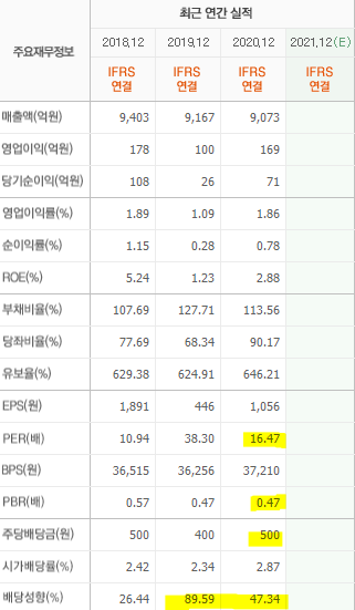 20년 연말 기준으로 PER은 16배 PBR은 0.47배를 기록하였습니다.