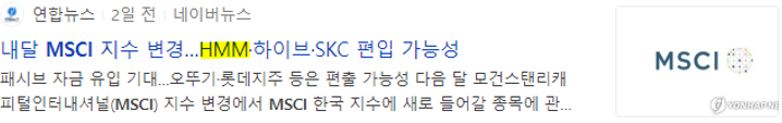 다음 달 모건스탠리 캐피털 인터내셔널 지수 변경에서 HMM이 MSCI 한국 지수에 새로 들어갈 것으로 예상됩니다.