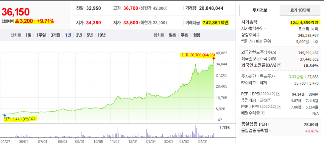 4/26일 종가 기준 9.71% 상승한 36,150원입니다.