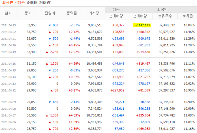 저번 주 금요일 외국인이 2백만 주나 매도하면서 2% 넘는 하락을 하였습니다.