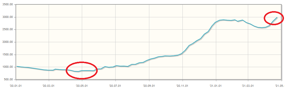 5월에는 거의 3천포인트에 육박하면서 역사상 최고치를 기록하였습니다.