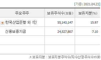 한국산업은행이 15.97%로 가장 많은 지분을 보유하고 있습니다.