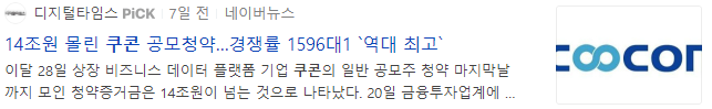 쿠콘은 청약증거금 14조원 경쟁률 1596대 1로 역대 최고 경쟁률로 청약을 마감하였습니다.