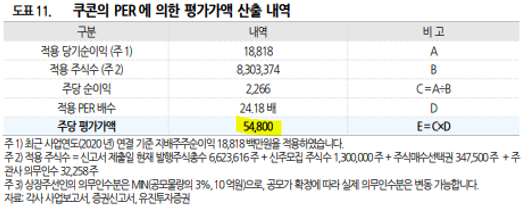 2020년 쿠콘의 주당순이익 2,266원에 평균 PER을 곱하면 54,800원이라는 적정주가가 나옵니다.