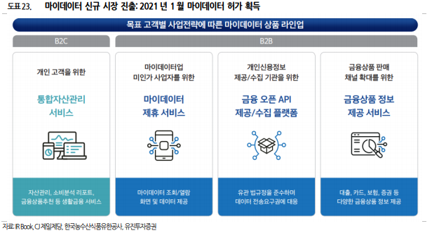 또한 2021년 1월 마이 데이터 허가를 획득하여 마이 데이터 상품 4종으로 시장 선점을 하고 있습니다.