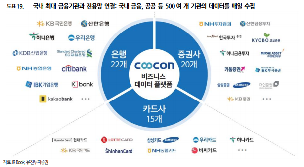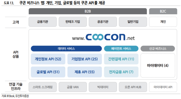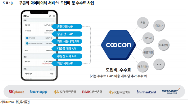 쿠콘은 은행, 증권사, 공공기관 등 다수 기관의 데이터에 대한 접근권을 통해 정보를 수집 및 연결해주는 사업을 하고 있습니다.
