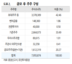 또한 기존주주는 33%, 이번 신규상장으로 공모주를 받게 될 주주는 20% 내외입니다.