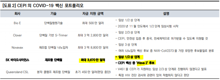 SK바이오사이언스는 글로벌 국제기구인 'CEPI(감염병 혁신연합)'와의 코로나 백신을 공동 개발하고 있습니다.