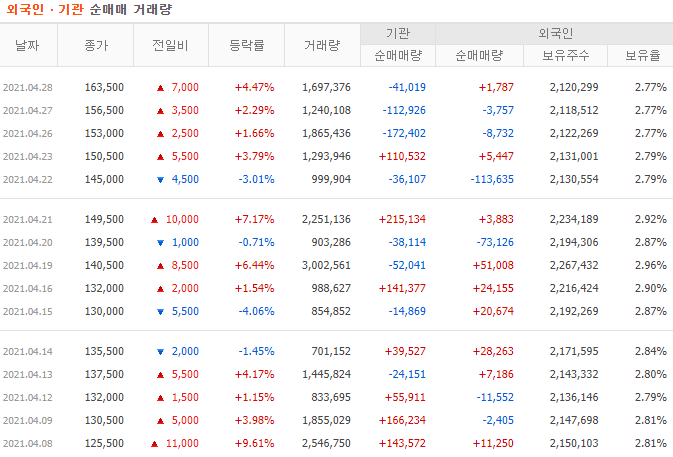 오늘은 계약조건에 대한 부정적인 인식으로 8% 하락한 15만 원을 기록하고 있습니다.