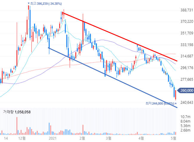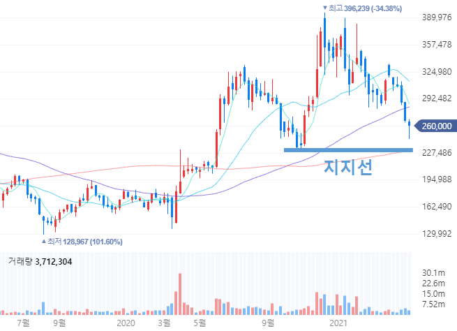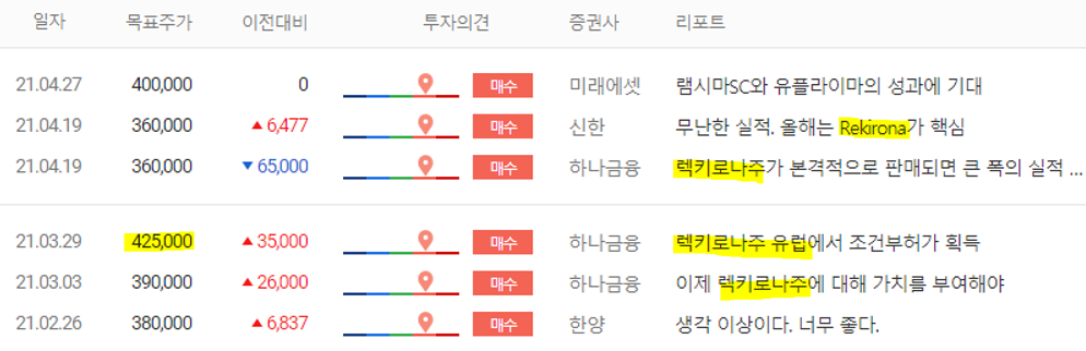 증권사 최고 목표주가는 425,000원으로 현재 가격 대비 63% 상승여력이 있습니다. 리포트들을 제목을 보면 렉키로나주의 활약이 가장 큰 포인트로 두고 있습니다. 작년과 대비해서 매출액이 50% 이상 상승하며 사상 최대 매출을 기록하게 하는 효자 역할을 하기 때문입니다. 물론 기존의 자가면역질환 치료제인 램시마를 비롯한 제품들도 유럽시장에서 견고한 시장점유율을 보여주면서 경쟁력을 보여주고 있습니다. 다만, 내년 실적에 대한 불확실성과 공매도 재개로 인해서 주가가 하락하고 있습니다.