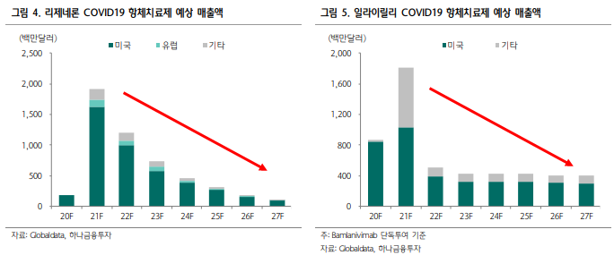 다만 코로나19 치료제의 경우, 올해가 가장 매출액이 높고 내년부터는 매출 규모가 줄어들 것으로 예측됩니다. 따라서 미래가치를 선반영하는 주가의 특성을 감안할 때 셀트리온의 주가의 장기적인 상승은 힘들 것으로 보고 있습니다.
