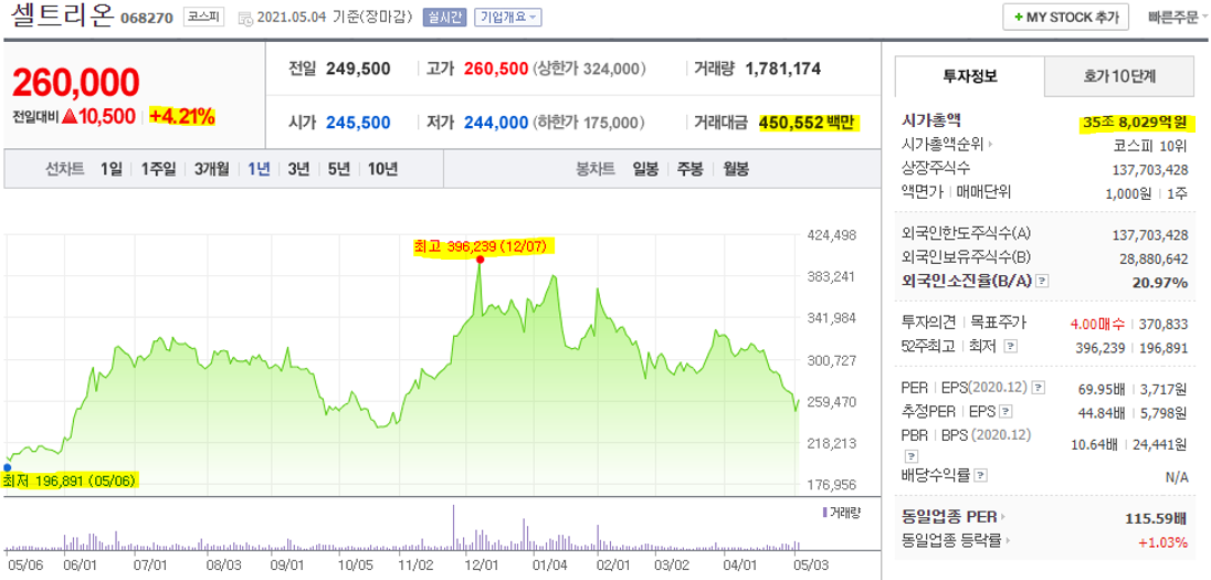 셀트리온은 05/04일 기준으로 4.21% 상승하여 10,500원 상승한 260,000원에 마감하였습니다. 거래대금은 4천5백억 정도입니다. 52 최저가/최고가는 196,891원에서 396,239원으로 2배가 차이 납니다. 시가총액 35조 8천억 원으로 코스피 10위 기업입니다.