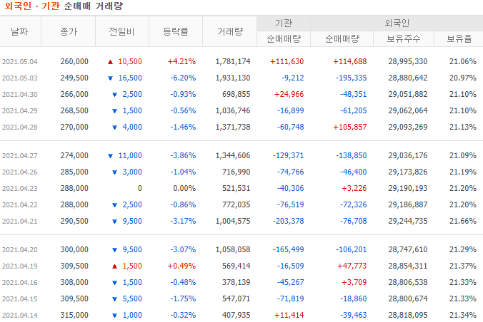 최근 15 거래일 동안의 외국인과 기관 순매매 거래량을 확인할 수 있습니다. 보통 일평균 거래량은 1백만 주 정도로 추정됩니다. 기관의 경우 계속해서 매도를 유지하다가 05/04일에 10만 주 정도 매수하였습니다. 외국인도 마찬가지로 전일 매수하였고 보유율은 21.06%입니다.