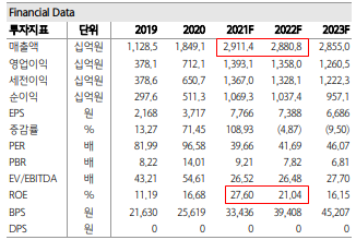 또한 셀트리온의 대외 판매는 셀트리온 헬스케어가 담당하기 때문에 가격을 셀트리온 공급가로 측정해야 합니다. 이러한 복합적인 조건들로 계산해 보았을 때 렉키로나주 매출 규모는 약 8,400억 원으로 추정됩니다. 이를 통해 올해 셀트리온 매출을 예측해보면 전년 대비 57% 성장한 약 2.9조 원으로 예상됩니다. 영업이익은 1조 3천억 원이며 ROE는 27.6%로 매우 높은 수익성과 성장성을 보여줍니다.