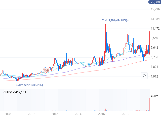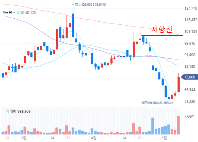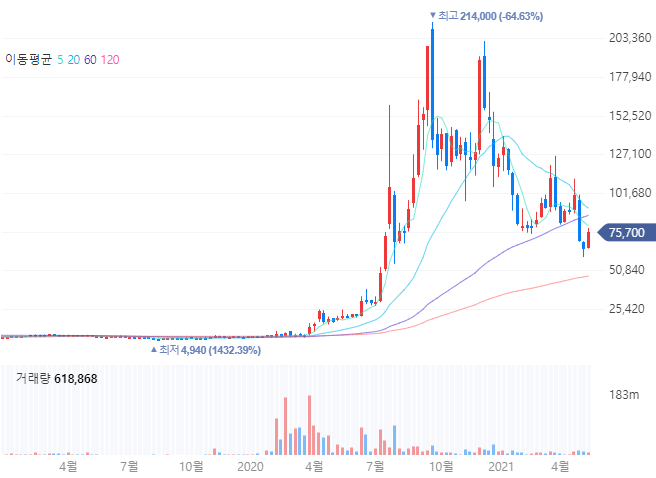 05/10 장중 거래대금 6천억원으로 장중 16% 넘게 상승하여 75,100원을 기록 중입니다. 시가총액 4조 원 정도로 코스피 80위 기업입니다. 52주 최저가 18,750원이며 최고가는 214,500원입니다.