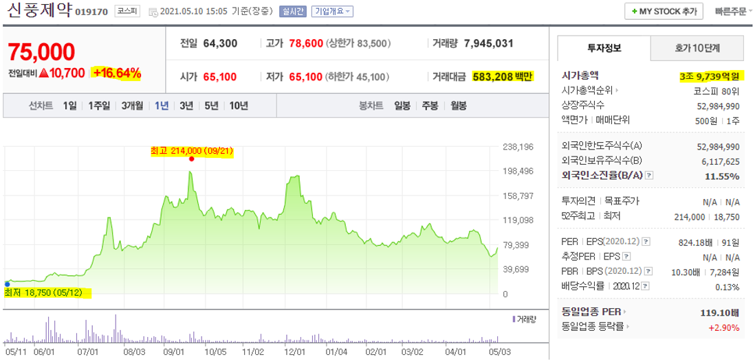이러한 이유로 신풍제약에서 피라맥스를 코로나19 치료제로 허가받기 위해서 임상시험을 진행하였습니다. 치료제 허가에 대한 기대감으로 작년 주가가 2000%가 넘게 상승하면서 개미투자자들의 뜨거운 관심을 받았습니다. 그러나 최근 비슷한 방식으로 코로나 19 치료제 개발에 도전했던 대웅제약, 일양약품, 종근당 등이 줄줄이 임상에서 성과를 내지 못하고 있는 상황입니다. 이에 따라 작년 최고점인 20만 원을 찍고 최근 7만 원까지 가격이 하락하였습니다.