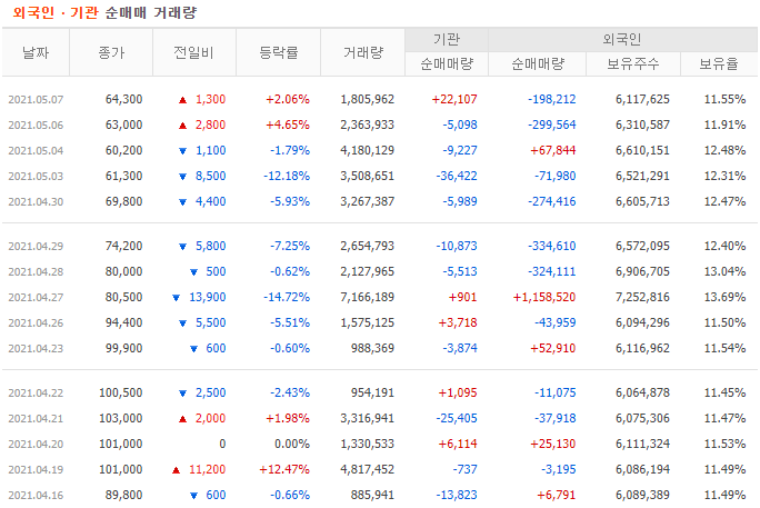 일평균 거래량은 3~4백만주 정도입니다. 기관의 매매량은 가장 많을 때가 4만 주를 넘지 않을 정도로 매우 적습니다. 오히려 외국인들의 매매량이 많은 편입니다. 외국인의 보유율은 2주 동안 11~13%를 등락할 정도로 변동성이 큰 것을 알 수 있습니다.