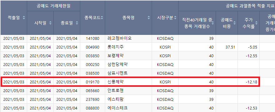 이에 따라 한국거래소에서는 급격한 주가하락을 막기 위해서 신풍제약을 비롯한 몇몇 주식들을 공매도 제한을 걸었습니다. 05/04일 하루 동안 공매도 거래를 제한하여 투자심리를 안정시키기 위해서입니다. 공매도 거래 제한 덕분인지 이후 크게 조정을 받지 않고 오늘까지 상승하면서 주가가 회복세를 보이고 있습니다.