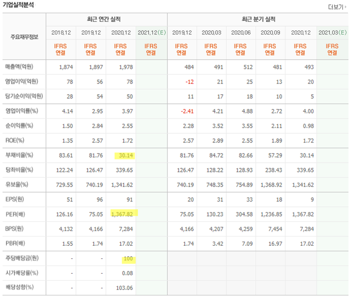 작년 연결실적을 보시면 꾸준히 흑자를 기록하면서 바이오기업으로써는 그럭저럭 나쁘지 않은 실적입니다. 특히 부채비율이 30%로 재무건전성이 높은 기업으로 볼 수 있습니다. 하지만 PER이 1367배로 터무니없이 고평가 받고 있는 것을 알 수 있습니다. 영업이익이 10배 상승해도 PER이 136배인 것을 생각해보면 대충 감이 오실 것으로 보입니다. 물론 코로나 치료제가 승인받기만 한다면 영업이익이 실제로 10배 상승하는 것도 불가능은 아니라고 생각합니다.