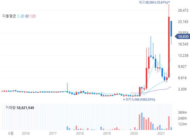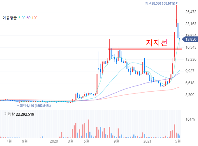 주봉 차트는 주가의 중장기적인 흐름을 볼 수 있는 차트입니다. 지난 고점이었던 1만 6천 원을 돌파하여 최고점 28,350원까지 기록하였습니다. 이후 조정을 받아서 18,850원까지 하락한 모습입니다. 차트에서 통상적으로 쓰이는 방법이 저항-지지선의 원리라는 것이 있습니다. 이전에 1만 6천 원이 저항선이었지만 돌파한 후에는 지지선이 된다는 것입니다. 따라서 16,500원을 지켜주면서 기간조정을 받는다면 다시 전고점을 돌파할 에너지를 모을 수 있을 것입니다.