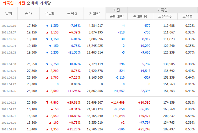 일평균 거래량은 주가가 하락하면서 조금 감소하였지만, 보통은 1천만 주가 넘는 날이 많을 정도로 거래가 매우 활발한 주식입니다. 특이하게도 기관과 외국인의 거래량이 거의 없습니다. 상승과 하락 모두 개인이 주도하고 있는 것으로 보입니다.