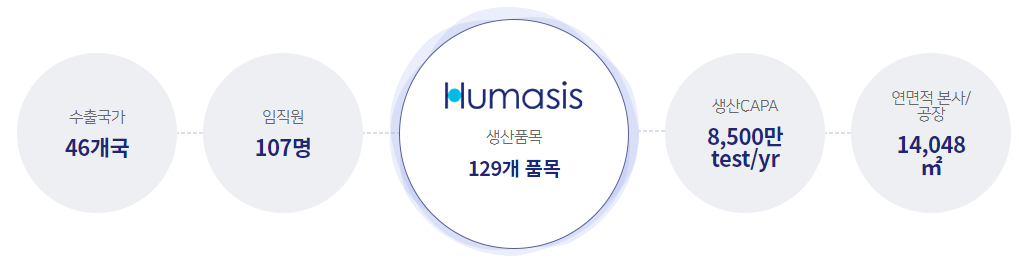 휴마시스는 시가총액 6451억 원으로 코스닥 117위의 기업입니다. 현재 129개의 품목을 생산하고 있으며 임직원 107명이 있습니다. 연간 8,500만 test/yr를 생산할 수 있고 46개국에 수출하고 있습니다.
