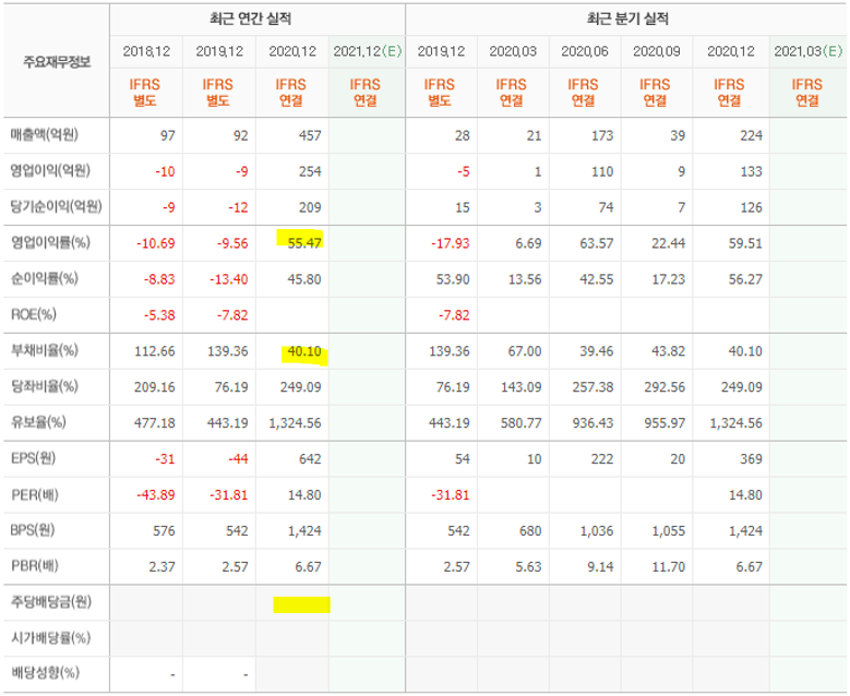 재작년까지 지속적으로 적자를 기록하면서 재무적으로 좋지 않은 흐름이었습니다. 부채비율은 140% 가까이 올라갔으며 매출액도 오히려 하락하였습니다. 하지만 코로나 19의 수혜로 작년 영업이익 254억 원을 기록하면서 영업이익률 55%라는 엄청난 수익률을 올리게 됩니다. 이후 차입금을 대폭 갚아나가면서 부채비율도 40%로 줄었습니다. 부채를 갚느라 아쉽게도 배당은 지급하지 못하였습니다. 하지만 올해는 사상 최대 영업이익을 낼 수 있을 것으로 전망하는 만큼 배당금이 지급될 확률이 매우 높습니다.