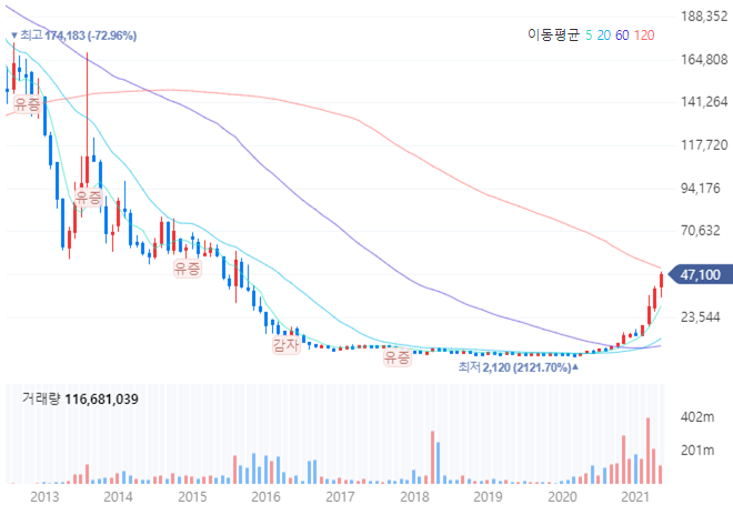 월봉차트는 기업의 거시적인 흐름을 볼 때 유용한 차트입니다. 위는 HMM의 지난 10년간 주가 흐름을 보여주고 있습니다. 선박의 과잉공급과 글로벌 경기침체로 인해서 수년간 적자를 지속했고 그 결과 주가가 1/20 토막이 됐습니다. 그리고 작년 코로나로 인한 글로벌 물동량 증가에 힘입어서 주가가 빠르게 회복되고 있는 추세입니다. 주가가 상승하면서 특정 가격대에 저항을 받는 곳이 거의 없기 때문에 어디까지 상승할지는 아직 아무도 모릅니다.