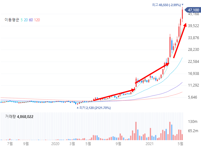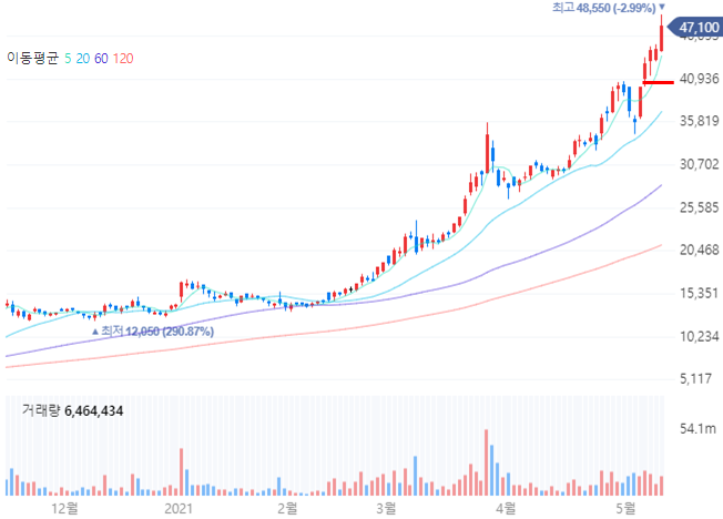 일봉 차트는 주가의 단기적인 흐름을 볼 때 유용한 차트입니다. 05/12일 전고점을 돌파하여 다시 한번 사상 최고가를 기록하였습니다. 급등하였기 때문에 5 거래일 정도는 쉬면서 조정을 받을 확률이 높습니다. 1차 지지선인 41,000원대를 지켜주면서 조정을 받는다면 다시 전고점을 돌파하는 흐름을 만들어 낼 수 있을 것으로 보입니다.