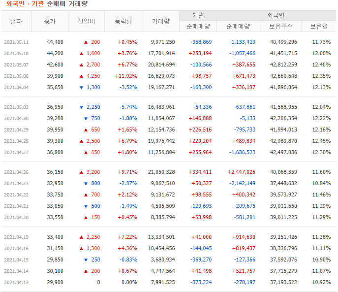 일평균 거래량이 천만 주를 가뿐히 넘길 정도로 매매가 매우 활발한 기업입니다. 기관은 최근 20 거래일 동안 매수를 더 많이 하였습니다. 외국인의 경우는 보합 상태를 유지하면서 보유율 11.73%를 기록하고 있습니다. 시가총액이 10조를 넘어가는데도 변동성이 매우 큰 종목입니다. 투자할 때 유의하시기 바랍니다.