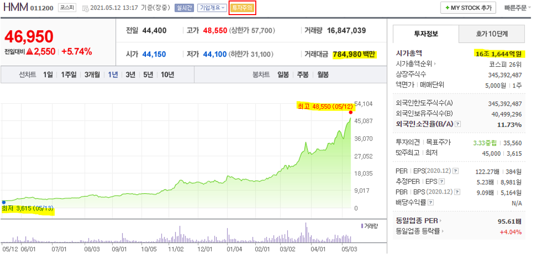 시가총액 16조 원으로 코스피 26위의 기업입니다. 05/12일 장중 5% 넘게 상승하여 46,950원에 거래되고 있습니다. 여기서 중요한 것이 HMM이 투자주의 종목으로 지정되었다는 사실입니다. 일정 기간 주가가 급등하면 거래소에서는 투자자들에게 주의를 환기시키기 위해서 투자주의, 투자경고, 투자위험 순으로 주가에 제한을 줄 수 있습니다. 특히 투자경고 종목으로 지정되면 매매가 정지될 수도 있기 때문에 매우 주의하셔야 합니다.
