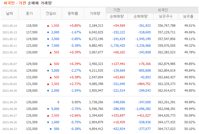 외국인과 기관 모두 크게 매도하고 있습니다. 개미들이 매도물량을 모두 받아내고 있는 형세입니다. 거래량은 일평균 500백만 주 이상으로 매우 활발한 것을 알 수 있습니다. 외국인 보유율은 49.01%를 기록하고 있습니다.
