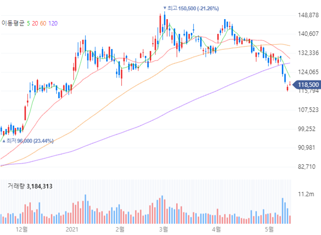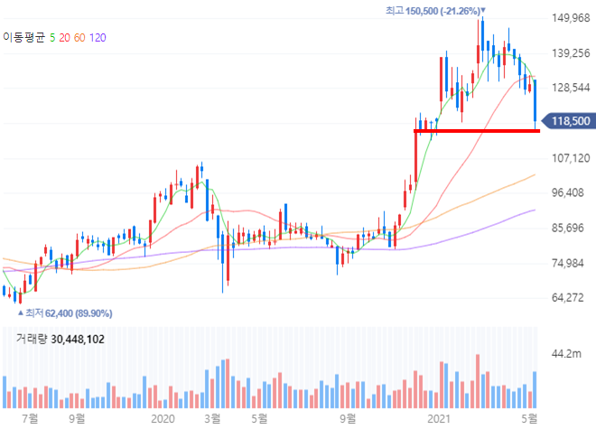 주봉차트는 중장기적인 흐름을 파악하는 것에 유용한 차트입니다. 위는 지난 1년간 SK하이닉스의 주가 흐름을 볼 수 있습니다. 5일선과 20일선의 데드크로스가 발생해서 중장기적으로 하향추세에 들어섰다고 보입니다. 빨간 선인 11만 5천 원 정도가 1차적인 지지선으로 보입니다. 위의 선이 지지선으로 작동하는지 여부가 향후 하락 추세의 기간에 영향을 줄 것으로 보입니다. 만약에 깨지게 된다면 하락 추세가 더욱 길어질 가능성이 높다고 봅니다.
